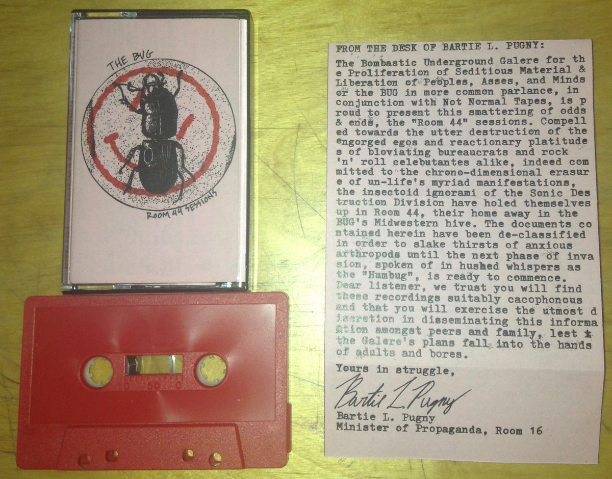 From the depths of the B.U.G.'s Midwestern, Subterranean compound, the Sonic Destruction Division emerges with six more tracks of noise and nonsense. Two-color xeroxed insert with lyrics and explanations, plus the first transmission from the Bug's Maw himself, Bartie L. Pugny.